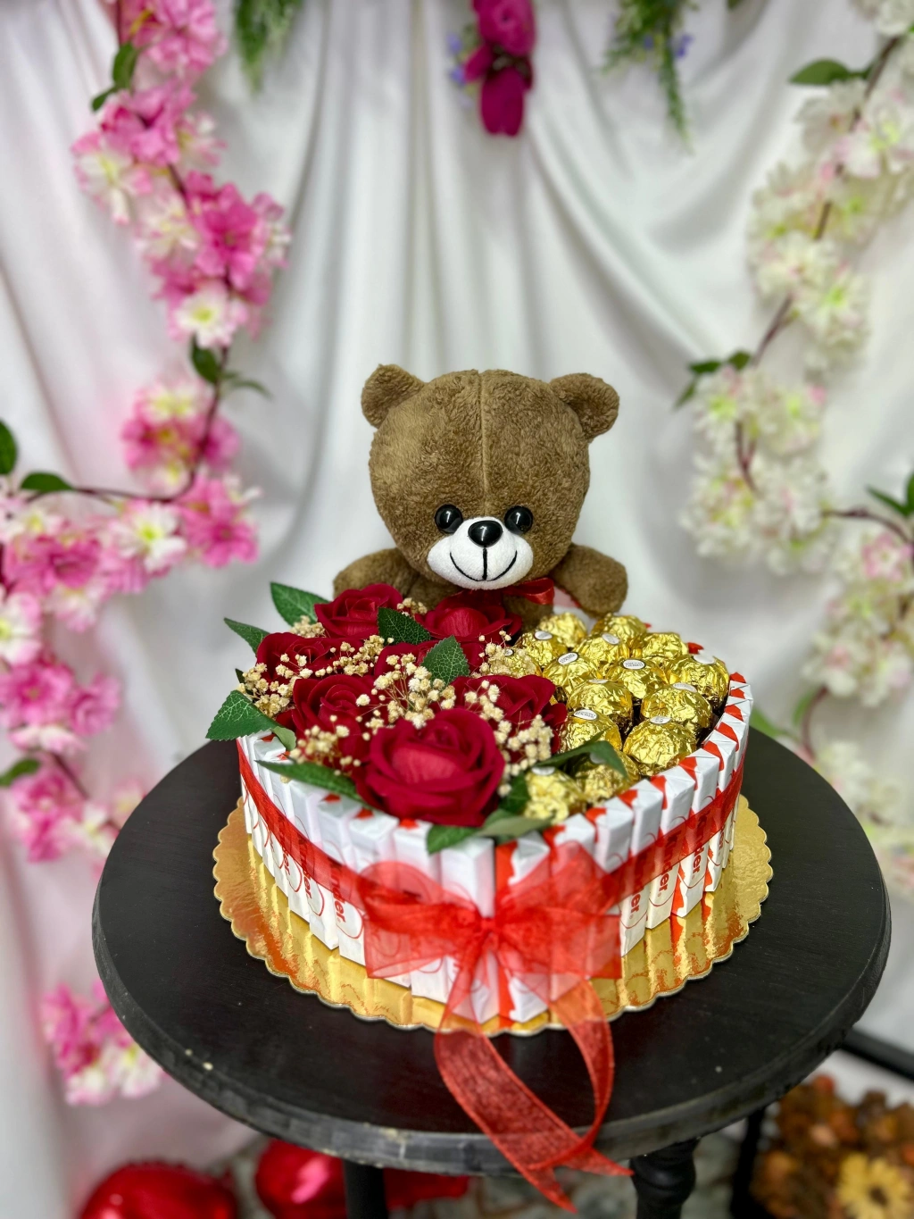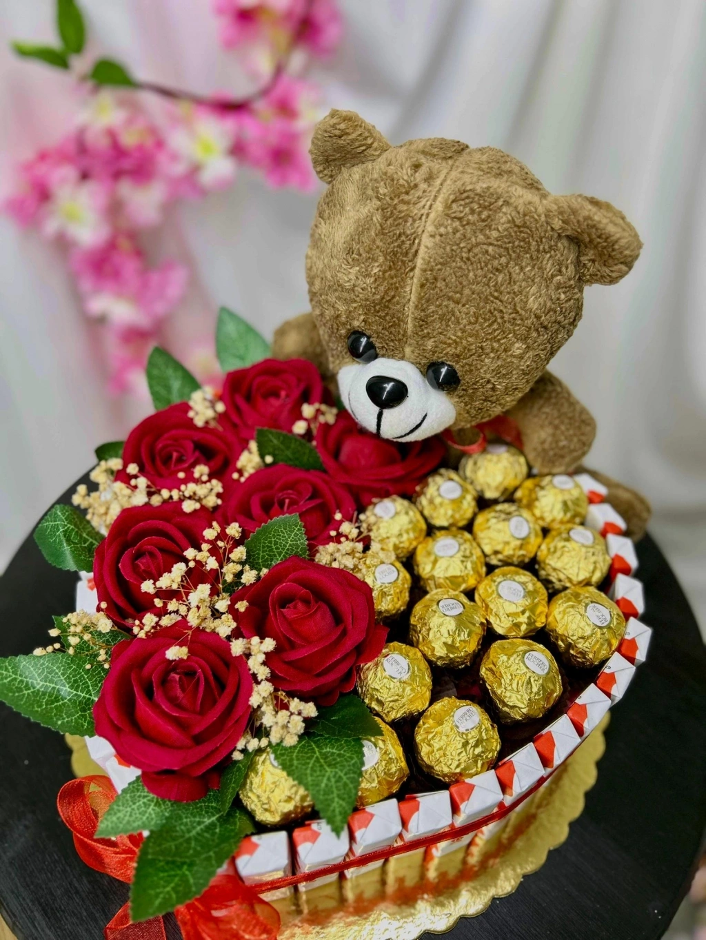 Fancy Flower Ayıcıklı Kadife Gül ve Çikolatalar seti ile karşınızdayız! Bu özel set, 25cm boyunda yumuşacık bir ayıcık, kadife güller, lezzetli Rocher ve Kinder Stick çikolatalarıyla sevdiklerinizi mutlu etmek için ideal bir seçenek.