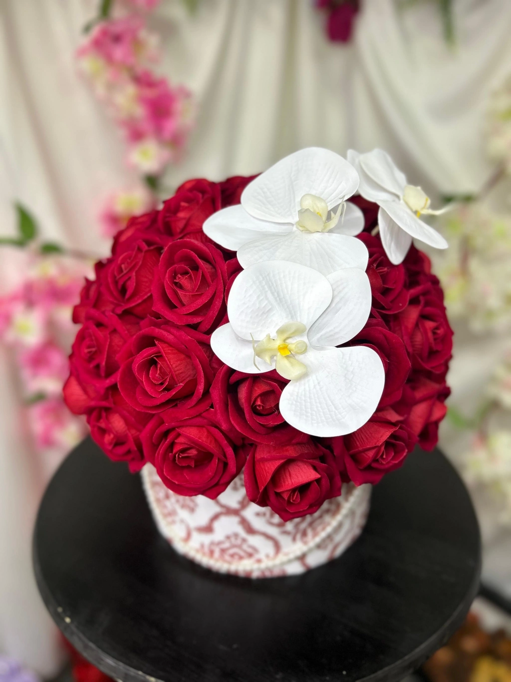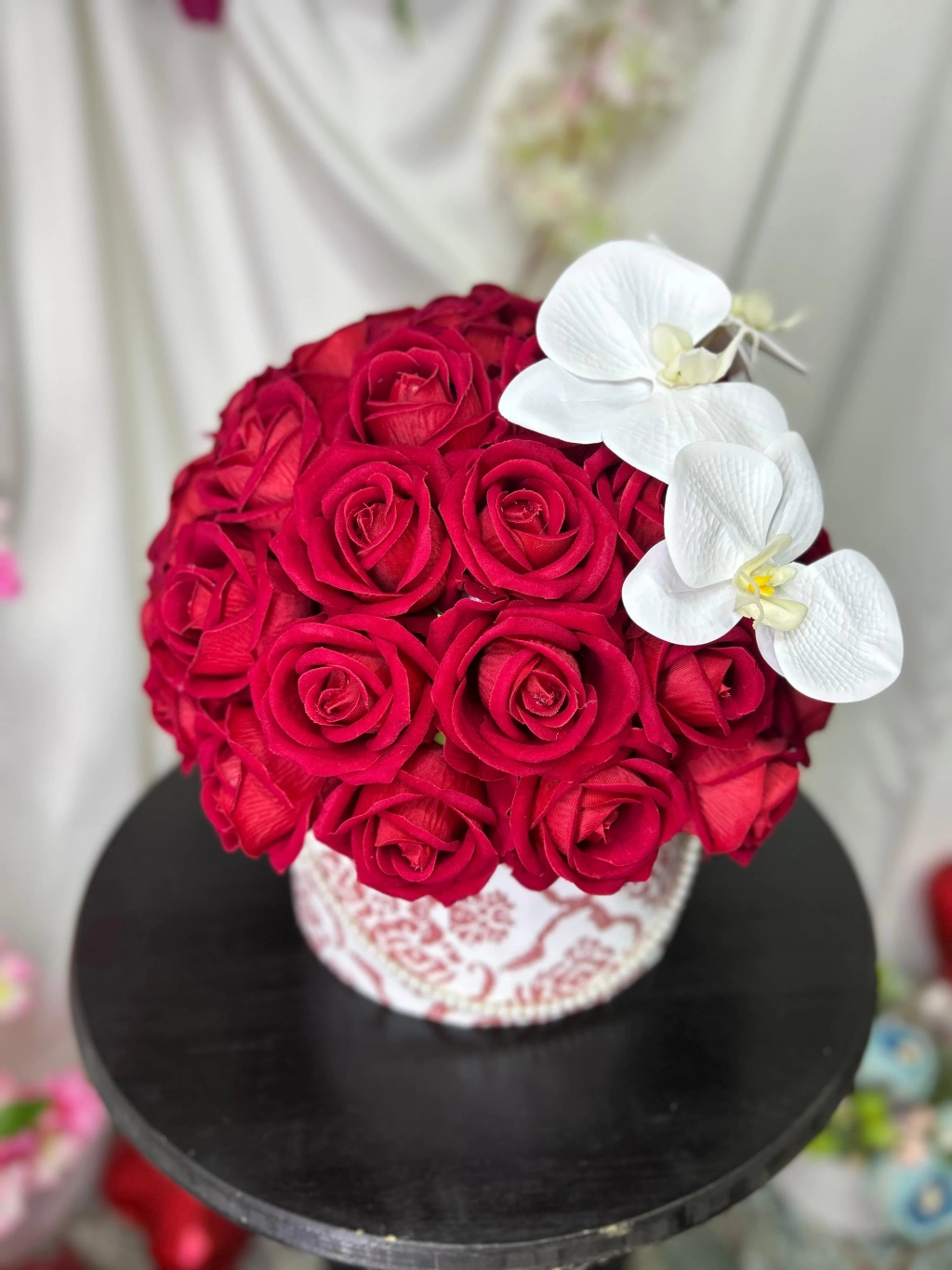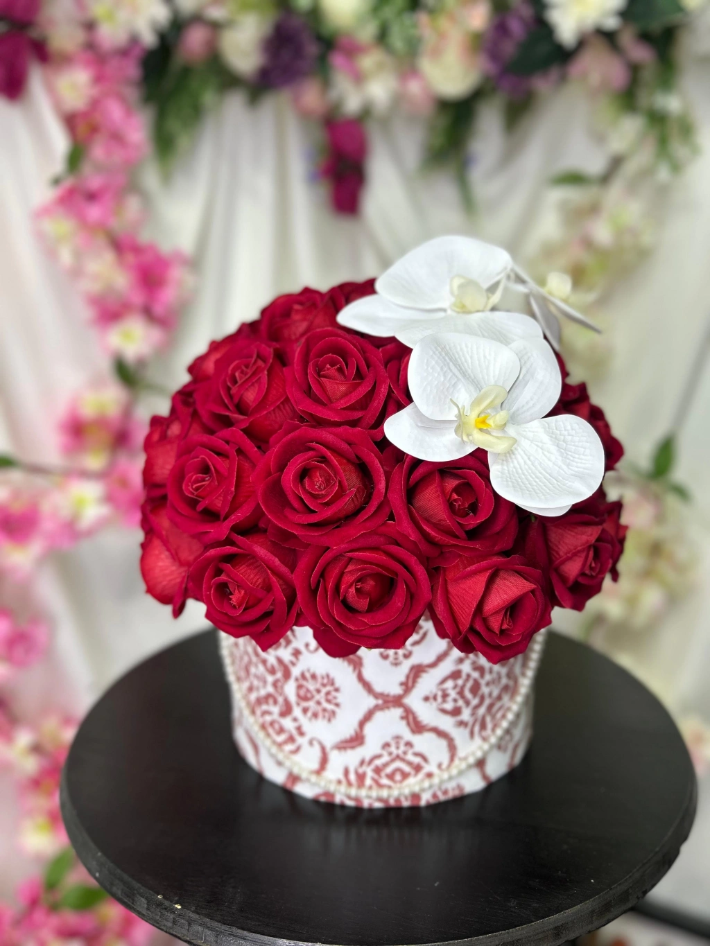 Inci detaylı şık kutusu, ıslak dokulu orkideler ve kadife kırmızı güller ile sevdiklerinizi etkilemeyi garantiliyor.