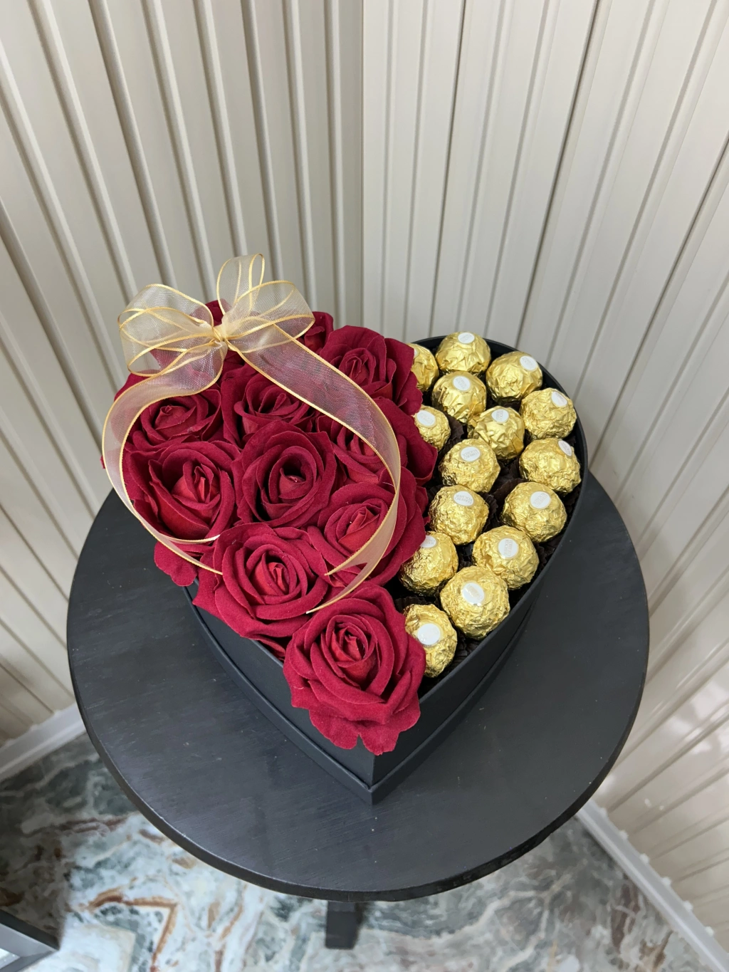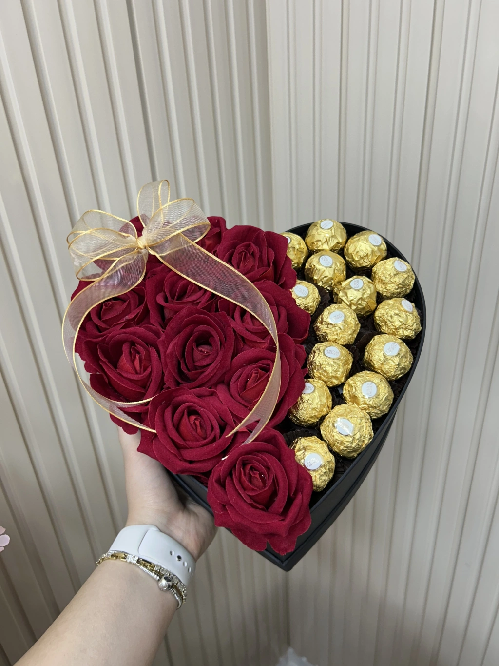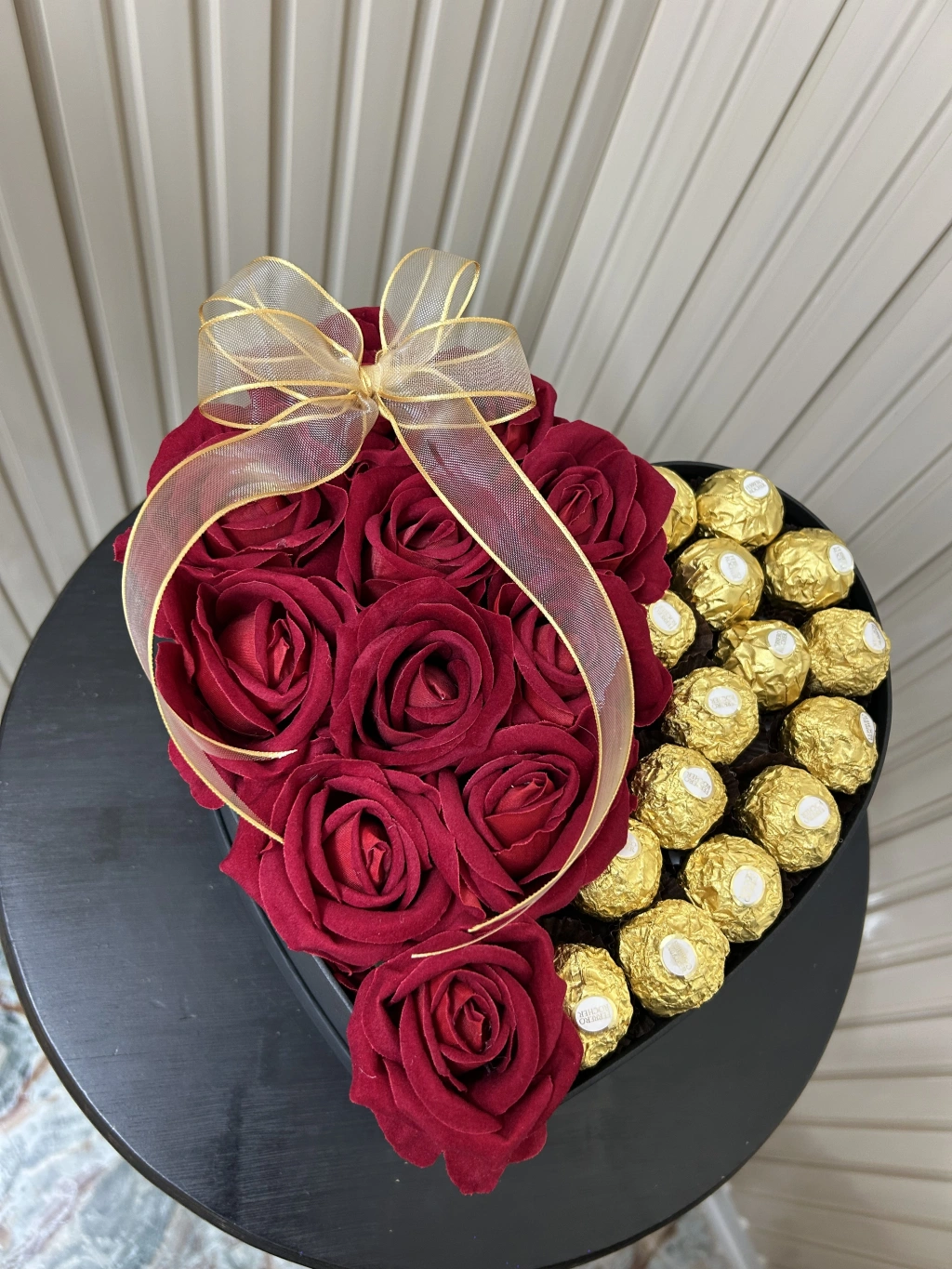 25 cm Kalp Kutuda Kadife Güller ve Rocher Çikolatalar