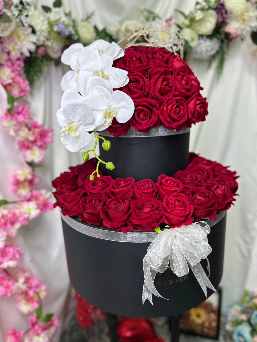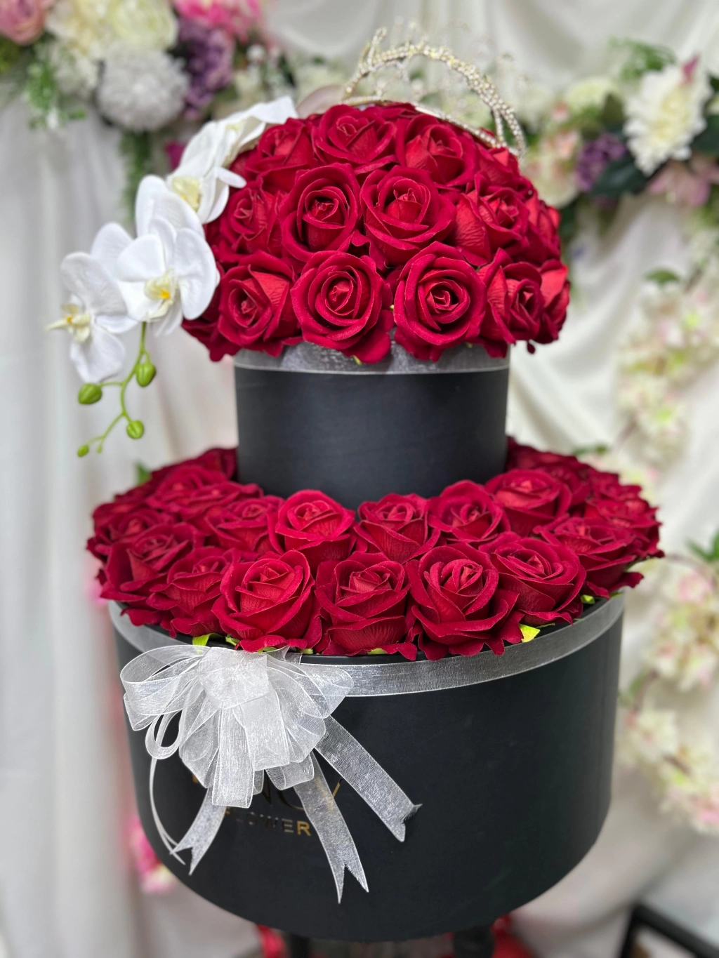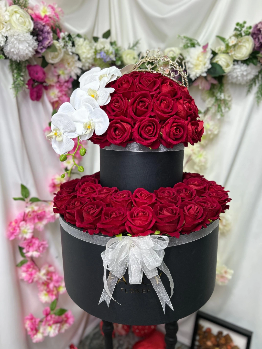 Şıklığın ve zarafetin simgesi olan Fancy Flower markasının Luxury Katlı Aranjmanı, özel tasarımı ile göz kamaştırıyor. Bu özel ürün, gerçek dokulu orkide çiçekleri, ışıltılı kristal taç detayı ve şık tasarımıyla dikkat çekiyor.