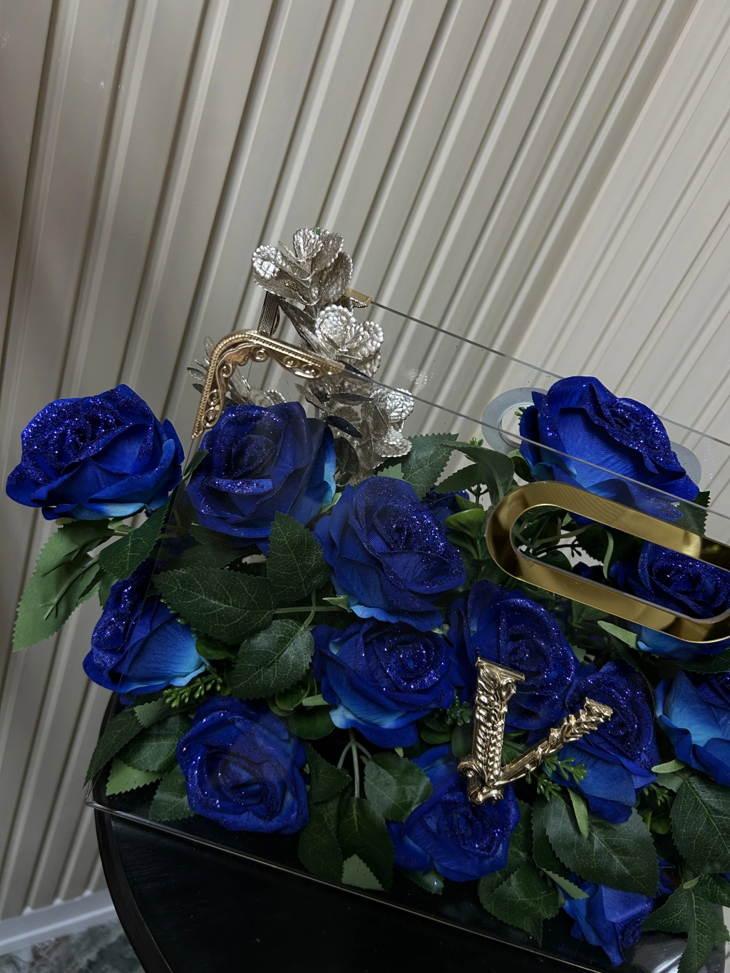 Premium Çantada Simli Mavi Kadife Güller