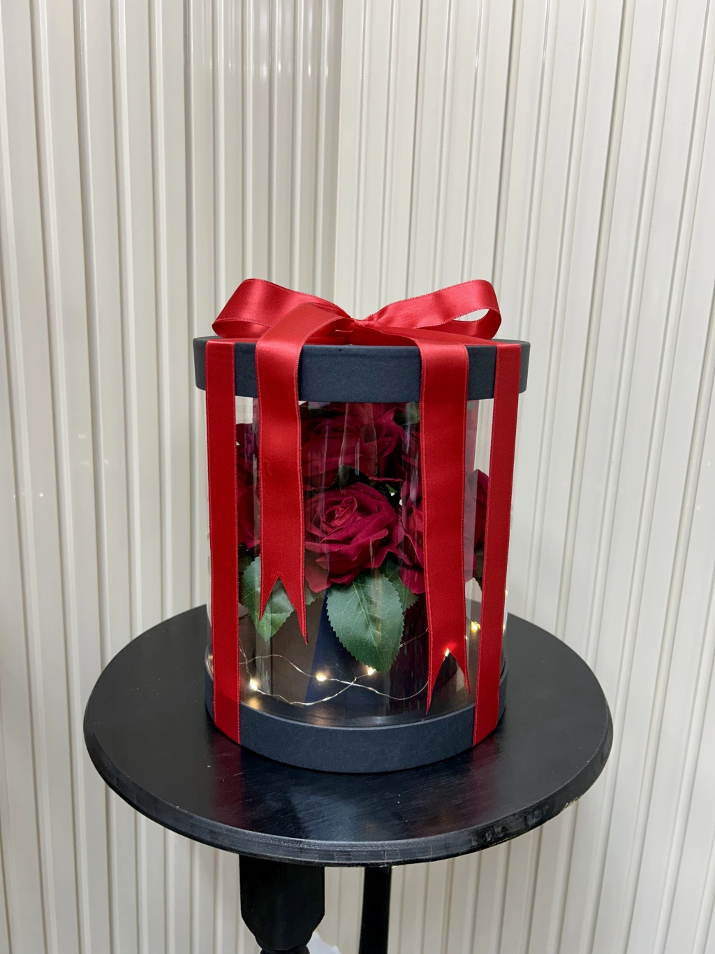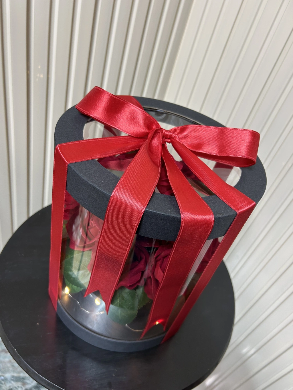Şeffaf Silindir Kutuda Işıklı Kadife Güller